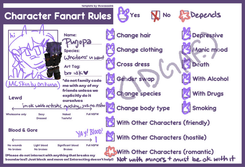 If you want art of real people (ex: mcyts, vtubers, etc) I will not draw any art that violates their boundaries